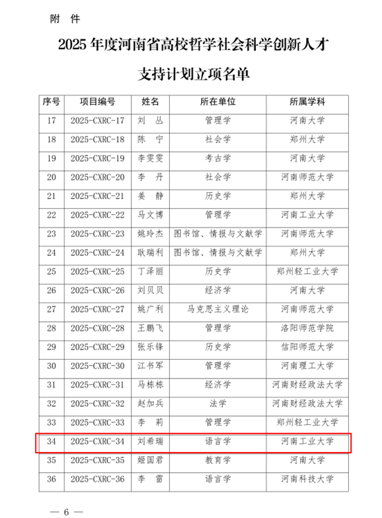 近日,河南省教育厅下发《关于公布2025年度河南省高校哲学社会科学创新人才支持计划立项名单的通知》(豫教工委〔2024〕227号)公布了2025年度河南省高校哲学社会科学创新人才支持计划立项名单。全省高校有39位教师入选2025年度河南省高校哲学社会科学创新人才支持计划,成人无码 有3名老师入选创新人才支持计划。其中,成人无码 教师刘希瑞副教授位列其中,获得立项资助。