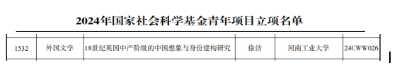 徐洁博士主持申报的《18世纪英国中产阶级的中国想象与身份建构研究》获批青年基金项目立项。