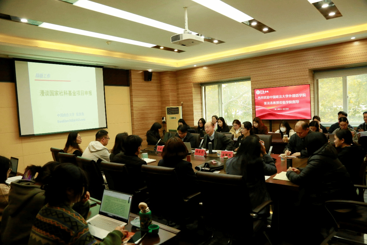 张法连以“中华学术外译申报指导暨涉外法治人才培养”为主题,结合多次获批高层次科研项目的成功经验,就国社科项目申报规则、申报流程等内容展开讲解,并重点强调了选题的重要意义——“既要新颖,更要符合当前国家战略需求”。在讲解国社科项目申报的具体内容时,他表示:创新是核心,要敢于使用具有创新性、逻辑性的新术语;明确文字能力的重要性,认真揣摩文字、标点符号、行间距等学术规范的问题。最后,详细介绍了中华学术外译项目的条件要求、外译过程的难点、出版注意事项和申报书撰写等方面的要点问题,最后展示了优秀的案例,为学院老师们提供了范本和参考。