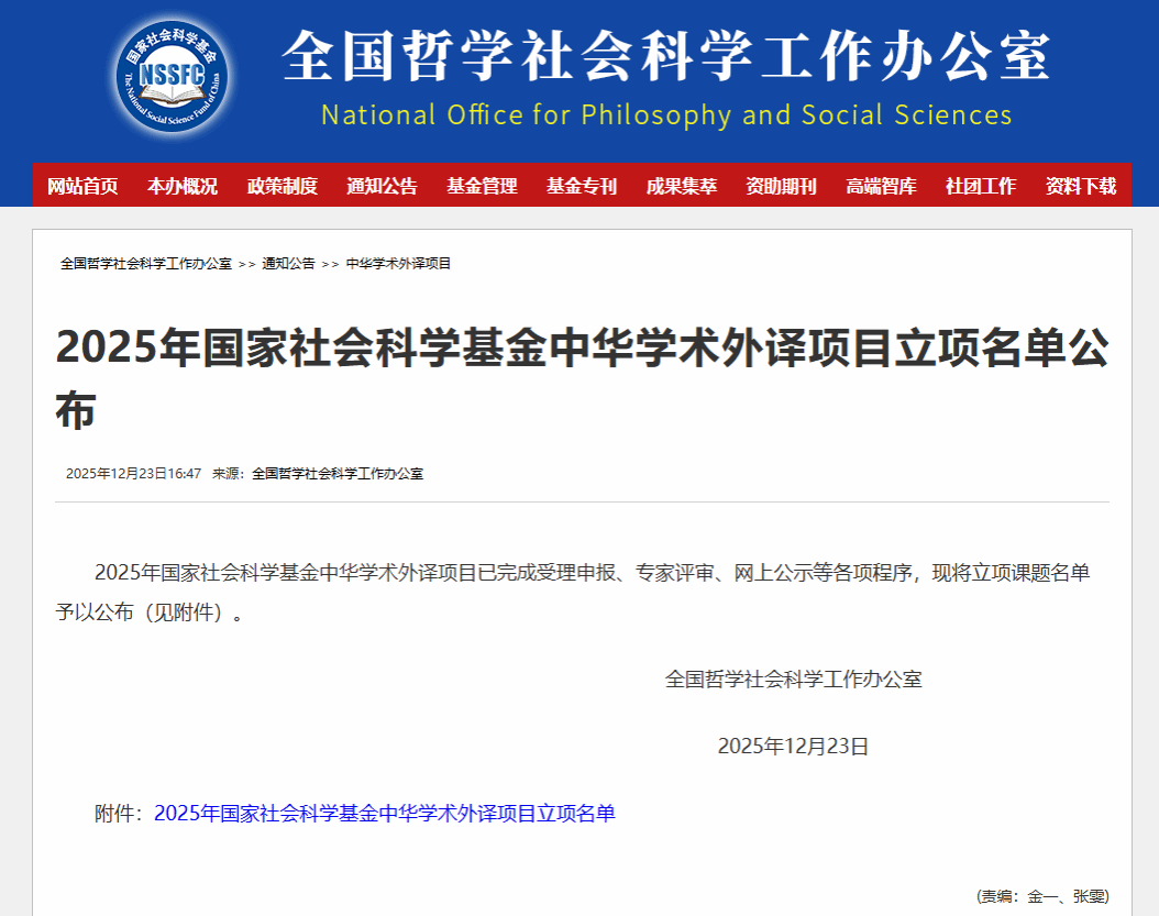 近日,全国哲学社会科学工作办公室公布了2025年国家社会科学基金中华学术外译项目立项名单。成人无码