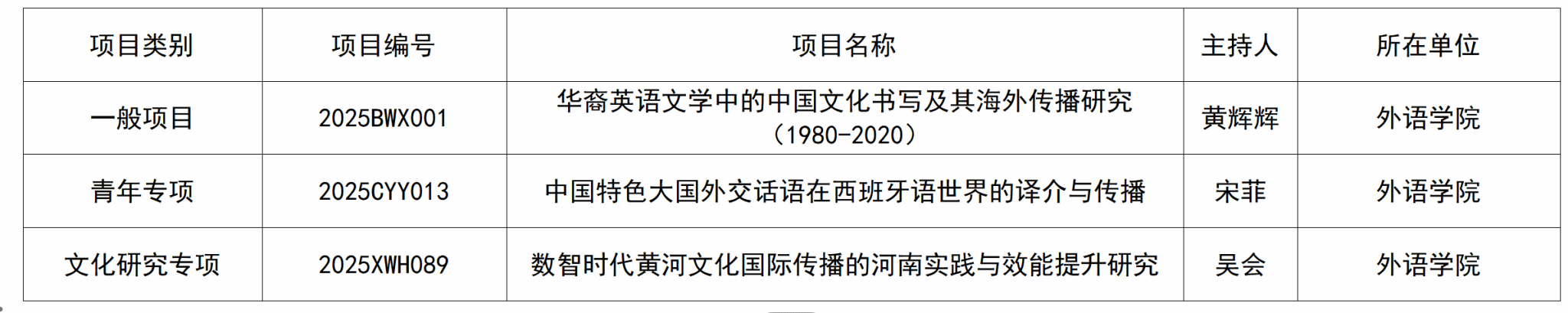 科研工作稳步推进、学科特色持续深化的体现。未来,学院将继续以高水平项目为牵引,推动学术创新与理论融合,助力中国特色哲学社会科学学科体系建设,为河南文化国际传播、中外文明交流互鉴贡献外语学科的智慧。(撰稿:徐洁 审校:沈国荣 审核:黄辉辉)