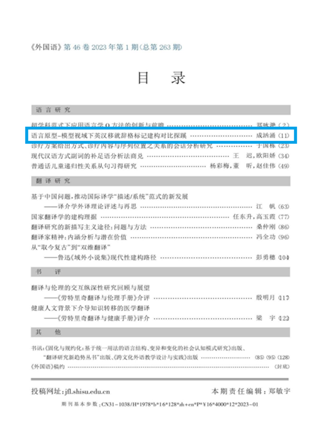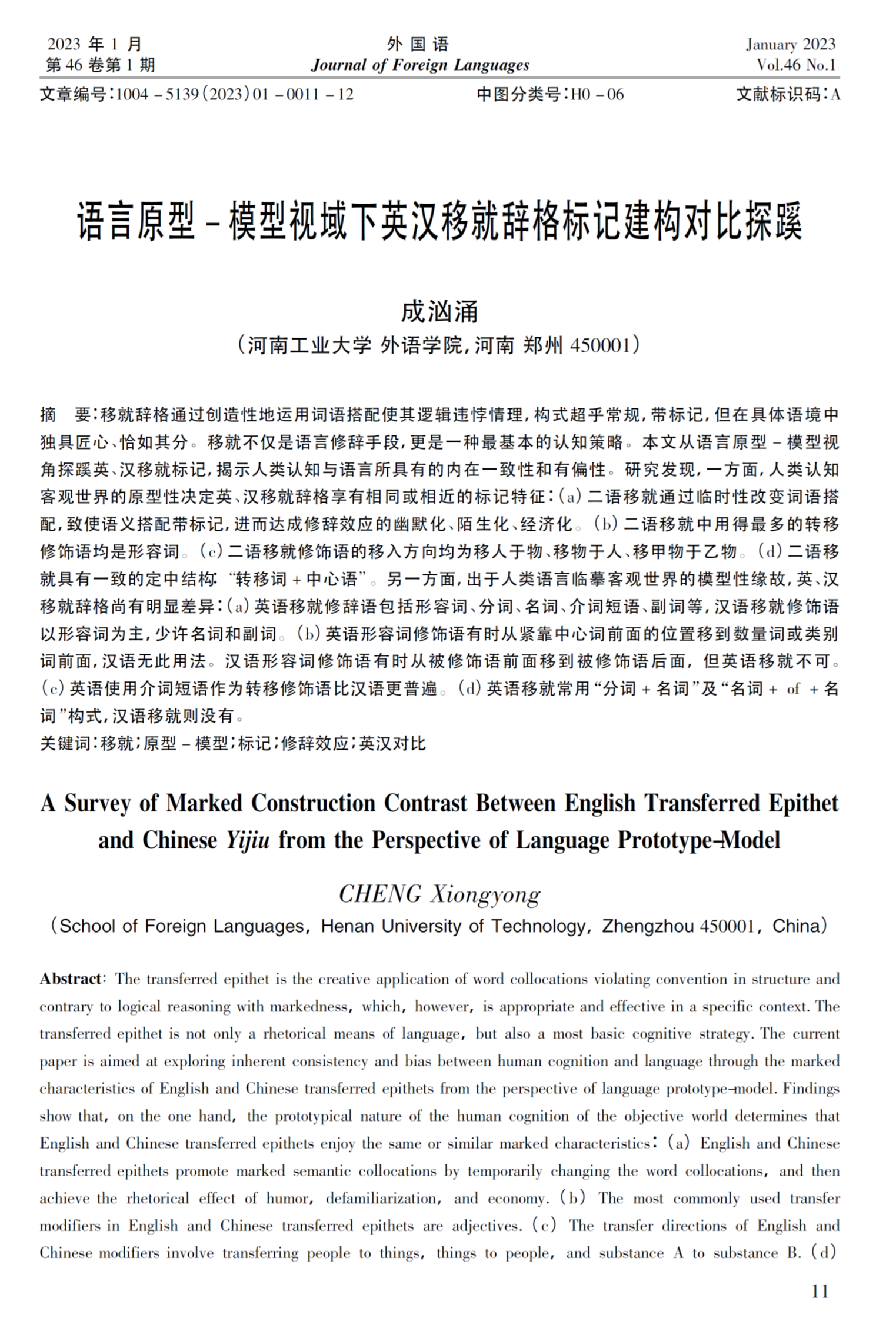 成汹涌教授在国内权威B类期刊《外国语》2023年第1期发表题为《语言原型—模型视域下英汉移就辞格标记建构对比探蹊》的学术论文,这是成人无码