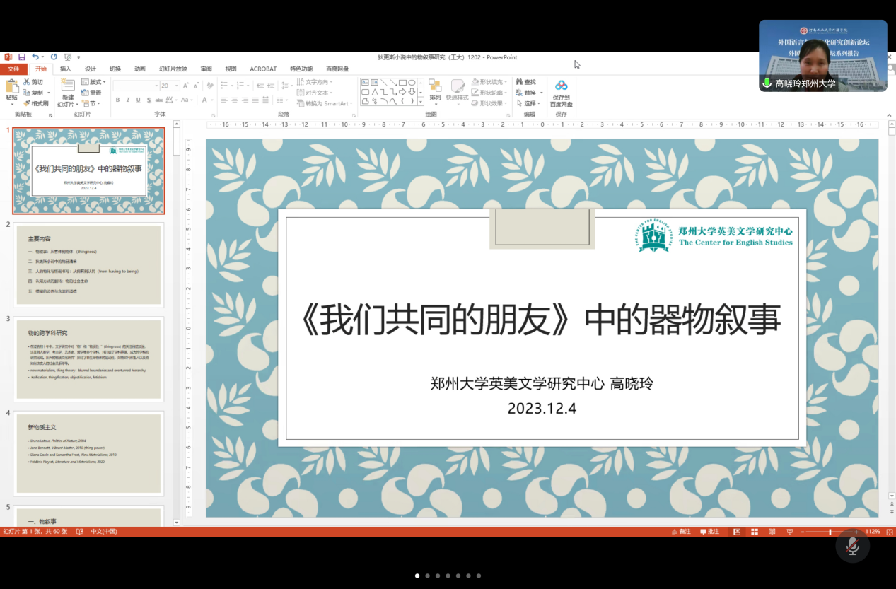 12月4日,首场讲座由高晓玲教授主讲,讲座主题是“《我们共同的朋友》中的器物叙事”。高晓玲生动形象地讲述了在狄更斯的小说《我们共同的朋友》中,器物不仅仅是推动情节发展和人物塑造的重要力量,它们还具有情感色彩和个性特征,被赋予了审美价值和道德功能,同时也操纵着人物之间的权力关系。此研究有助于我们理解和认识维多利亚时期英国的炫耀性消费、经济关系变化及阶层流动和社会冲突等问题。