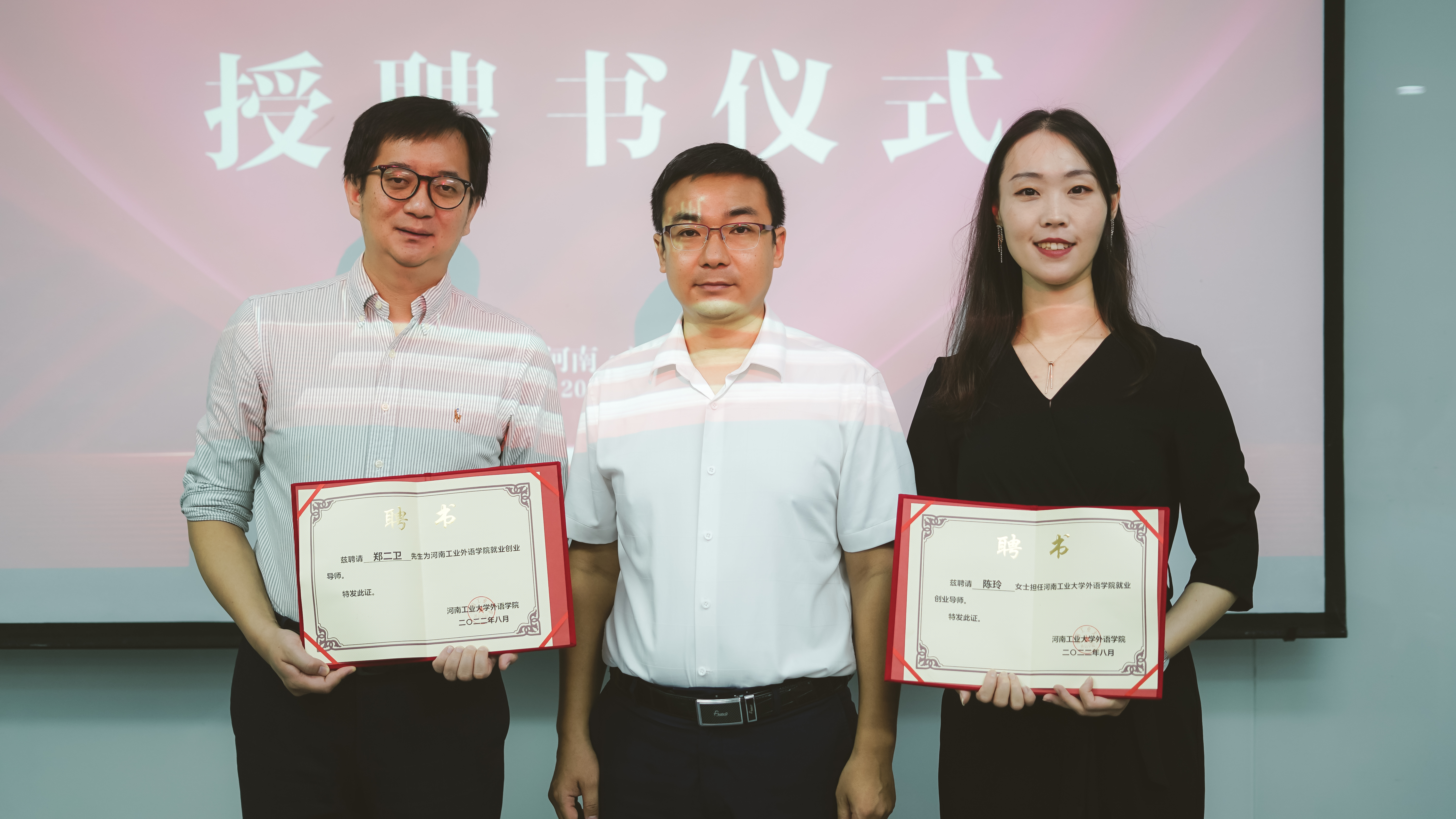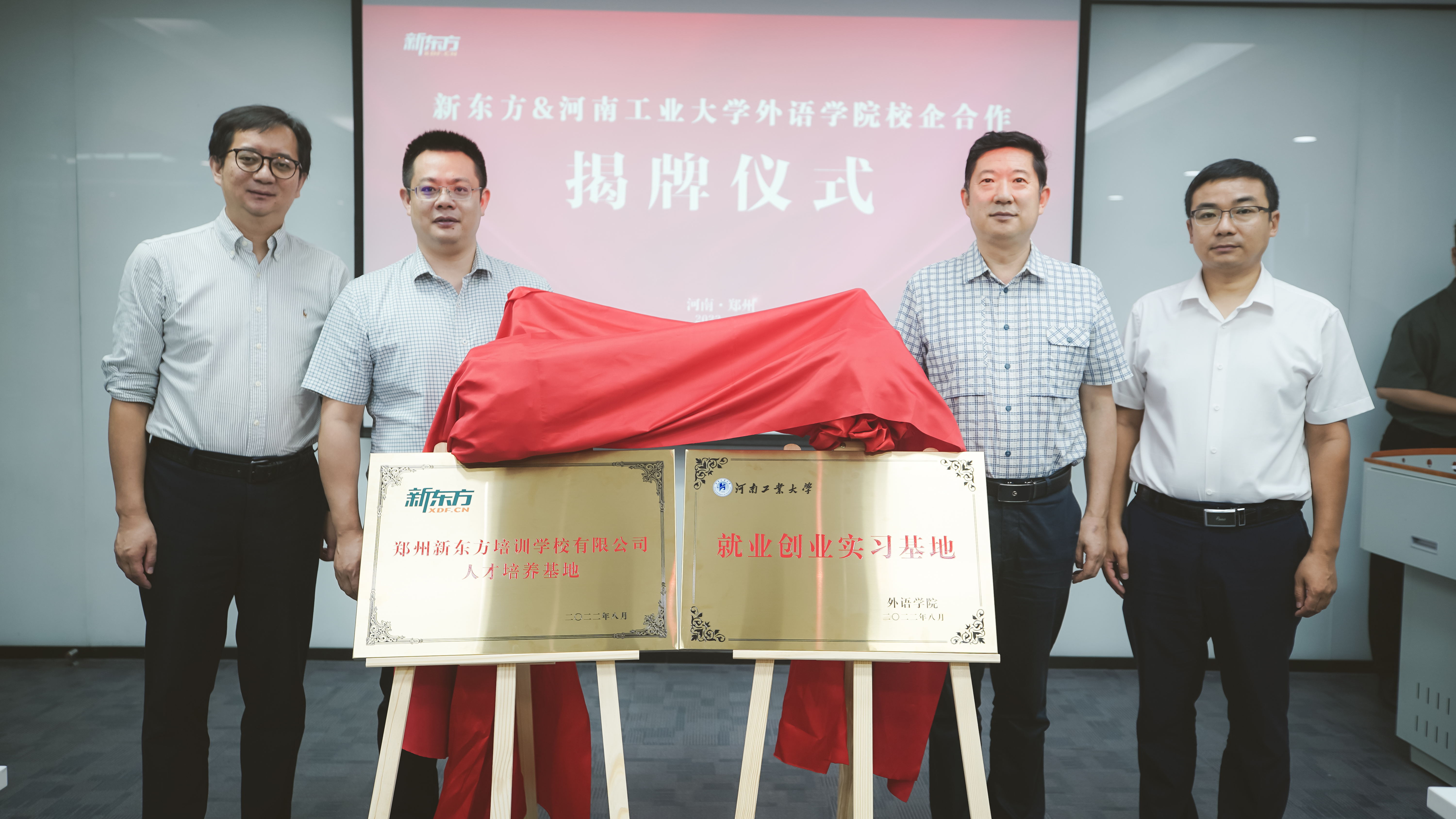 就业创业实习基地”“郑州新东方培训学校有限公司人才培养基地”揭牌。王云涛代表学院聘请郑二卫、陈玲担任就业创业导师,并为二位老师颁发了聘书。