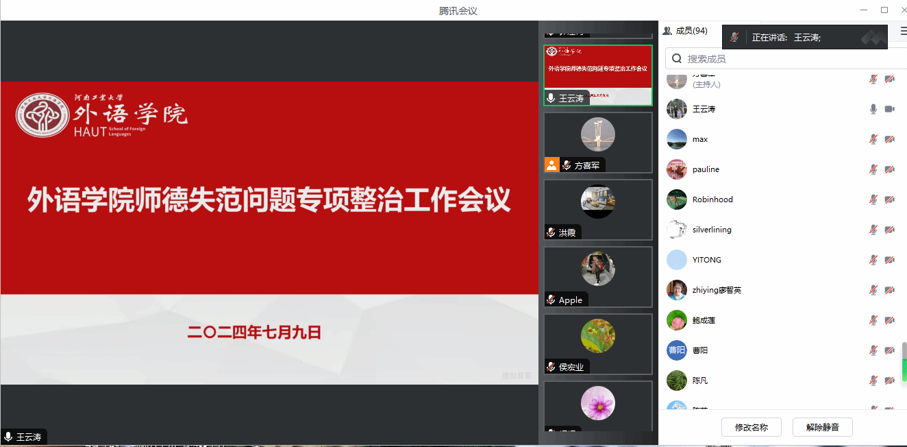 会上,王云涛从工作目标、整治内容、整治措施、工作进度等四个方面传达了《成人无码 关于开展师德失范问题专项整治工作方案》,领学了《成人无码 教师师德失范行为处理办法(征求意见稿)》,详细解读了7个方面33条师德失范行为界定及师德失范行为处置程序和处理措施,并对学院师德失范问题专项整治工作进行了安排部署。院长黄辉辉介绍了科研和学术诚信问题背景,传达了河南省教育厅关于印发《加强和改进高等学校科研诚信工作的若干措施(试行)》的通知,对文件进行详细解度,对学院科研和学术诚信提出具体要求,并对学院假期期间专业建设、招生就业、教师科研等工作进行了布置。