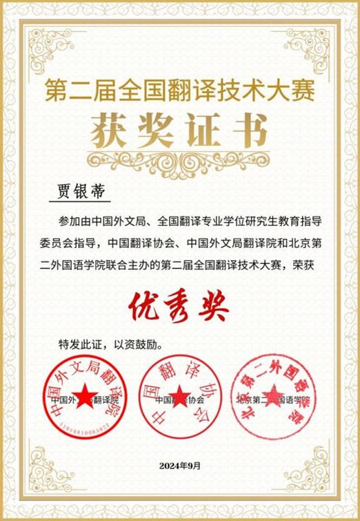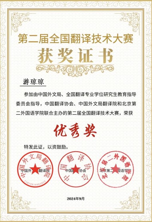 23级翻译硕士游琼琼、21级翻译本科生贾银蒂获得优秀奖,成人无码