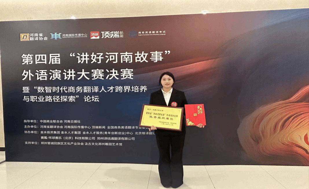 研究生郭雨秋在指导教师的精心指导下,历经三轮激烈角逐,凭借其深入的主题剖析,流利的英语表达和真挚的情感,将河南国家粮仓故事、工大粮食故事娓娓道来,用英语讲好河南故事、工大故事,展示了良好的外语表达能力和对河南文化的热爱与传承,喜获佳绩。
