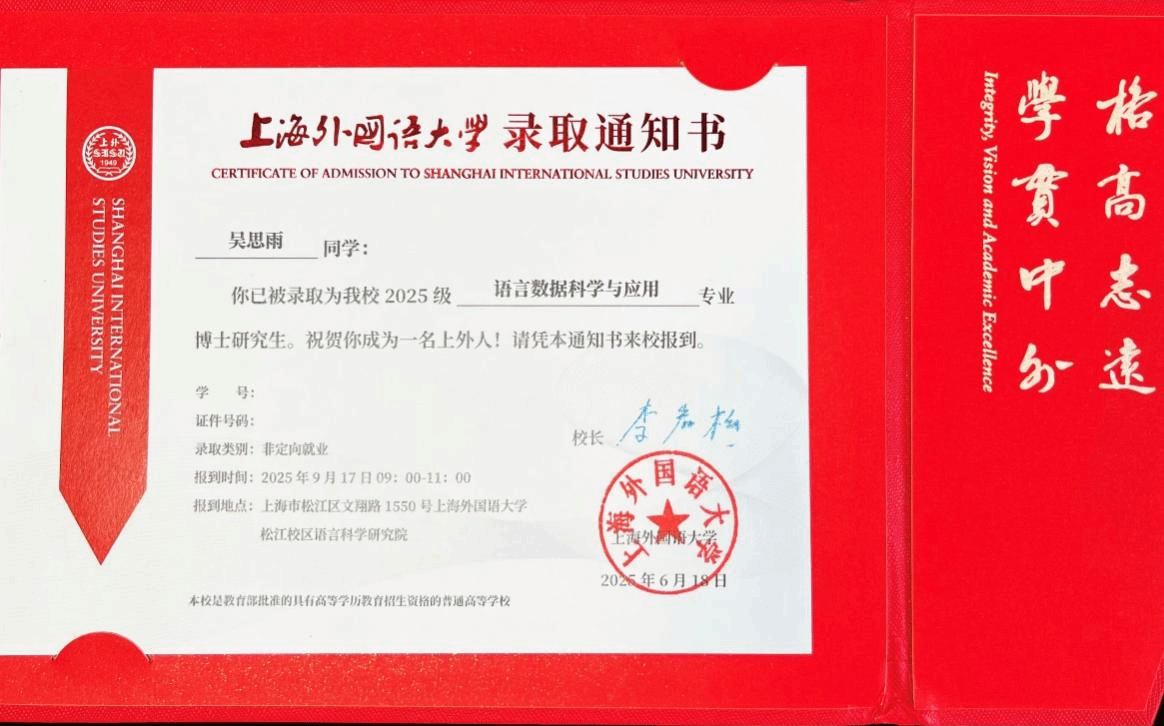 2025届硕士研究生吴思雨同学(导师:鲍成莲教授)成功考取上海外国语大学语言科学研究院语言数据科学与应用专业博士研究生。吴思雨同学的优异表现和录取成果,既源于其个人对学术与成长的不懈追求,也离不开导师全程悉心指导与学院优质教育资源的双重加持——从入学时个性化培养方案的制定,到科研过程中专业数据库的全权限开放与研究经费的系统化支持,再到职业发展阶段的精准升学与就业指导,学院通过全链条培养机制为学生搭建了成长阶梯。导师的言传身教与学院研究生培养体系的有力支撑形成强大合力,共同托举起学生的梦想与成就。