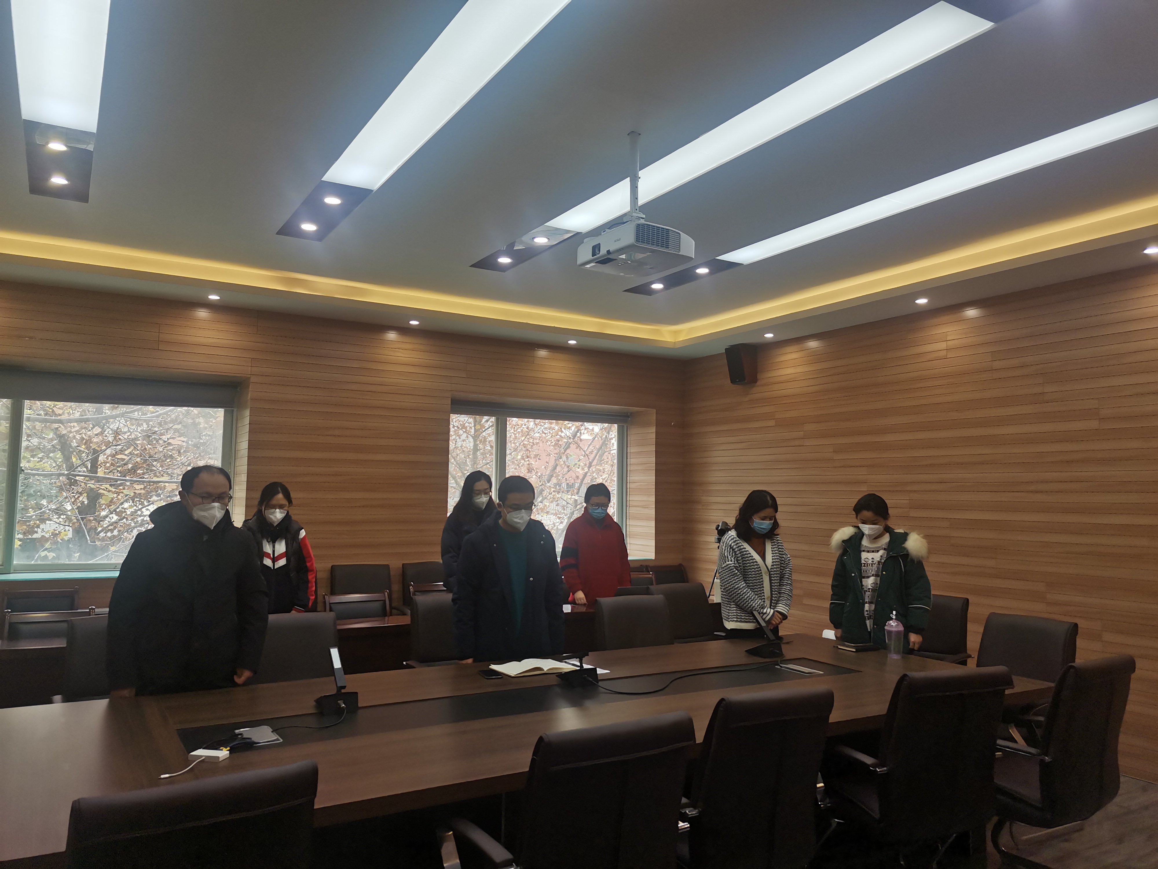 党委书记王云涛带领校内值班教职工在5231会议室集中收看,全程肃立,其他教职工通过腾讯会议观看追悼大会。