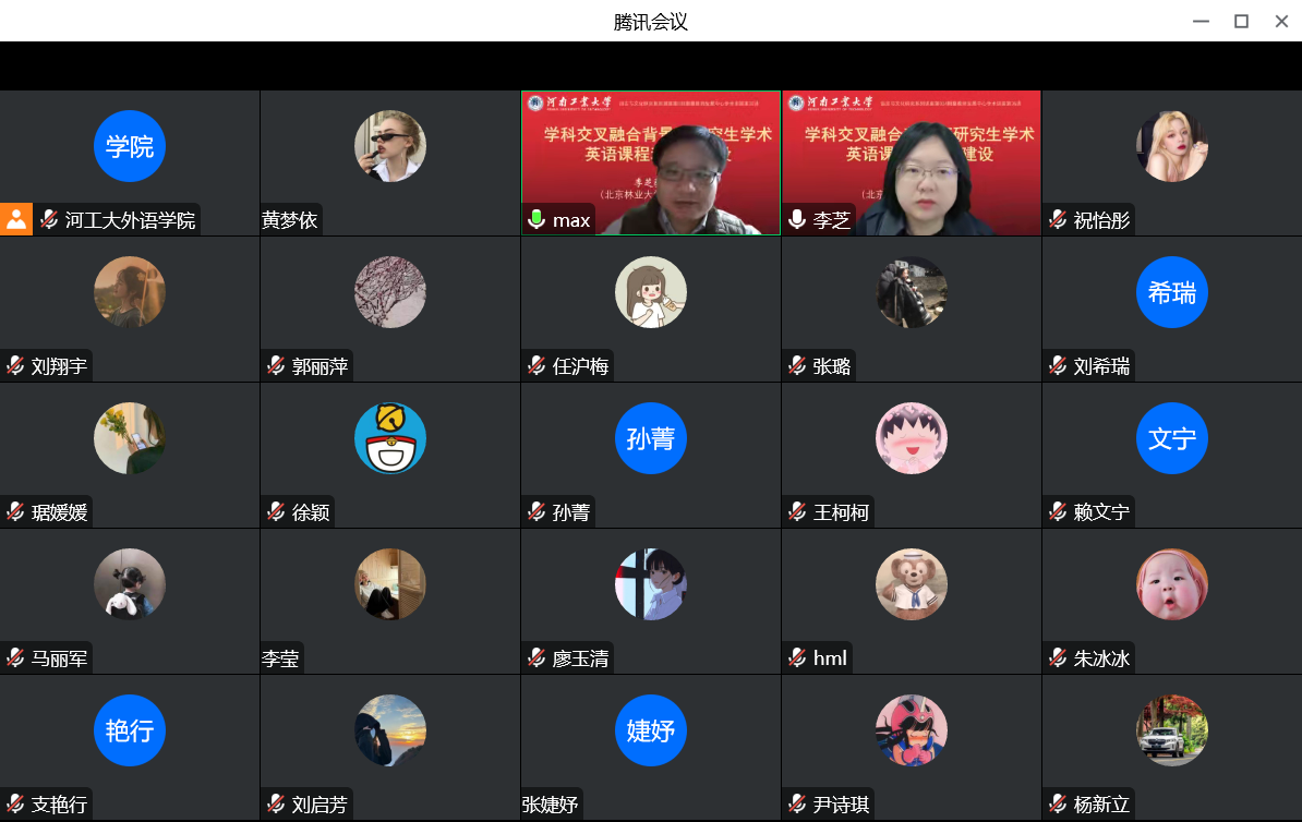 语言与文化研究系列讲座第013期暨教师发展中心学术讲座第34讲于12月6日如期在线举行,北京林业大学李芝教授带来了一场题为“学科交叉融合背景下研究生学术英语课程和教材建设”的精彩学术讲座。学院全体教师、教科研团队成员、在读研究生和外校学者等近百人参加了此次讲座。讲座由副院长沈国荣主持。