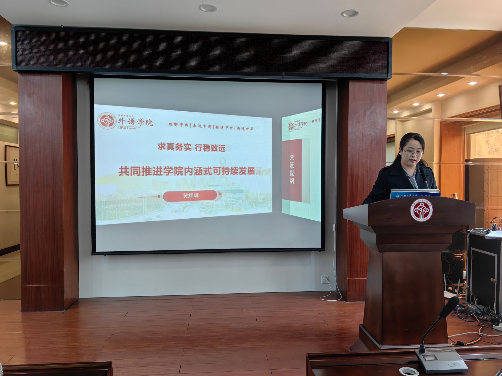 院长黄辉辉以《求真务实 行稳致远——共同推进学院内涵式可持续发展》为题作专题工作报告。她简要总结了2023年学院重点工作突破,并指出2023年在全院教职工共同努力下,学院圆满完成了各项目标考核任务,在河南省专业评价、科研经费到账、国社科项目立项、师资队伍建设等方面均取得了重大突破。在肯定成绩的同时,她结合成人无码