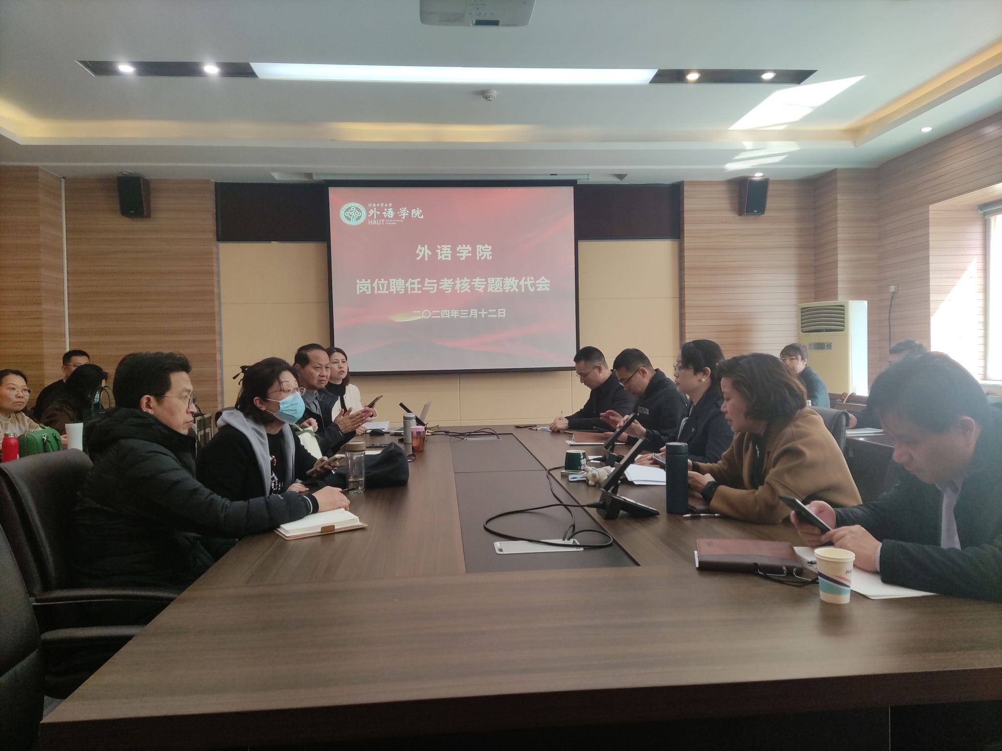 岗位考核任务说明书》,学院领导班子成员和教职工代表参会。会议由学院工会主席李建锋主持。