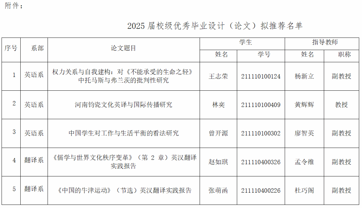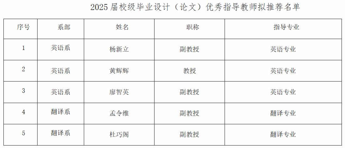 根据《成人无码 优秀本科毕业设计(论文)及优秀指导教师评选办法》(河工大政教〔2023〕24号)和《成人无码 本科毕业论文工作管理规定》(外语院政发〔2024〕4号),经系部推荐和学院审核,成人无码 拟推荐5篇毕业论文参评校级优秀本科毕业设计(论文),推荐5位指导教师参评校级优秀指导老师,现将拟推荐名单进行公示,公示时间为5月27日-5月29日。