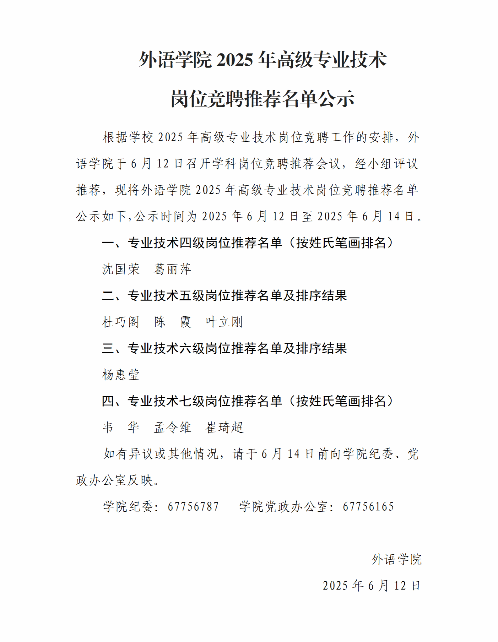 成人无码 2025年高级专业技术岗位竞聘推荐名单公示