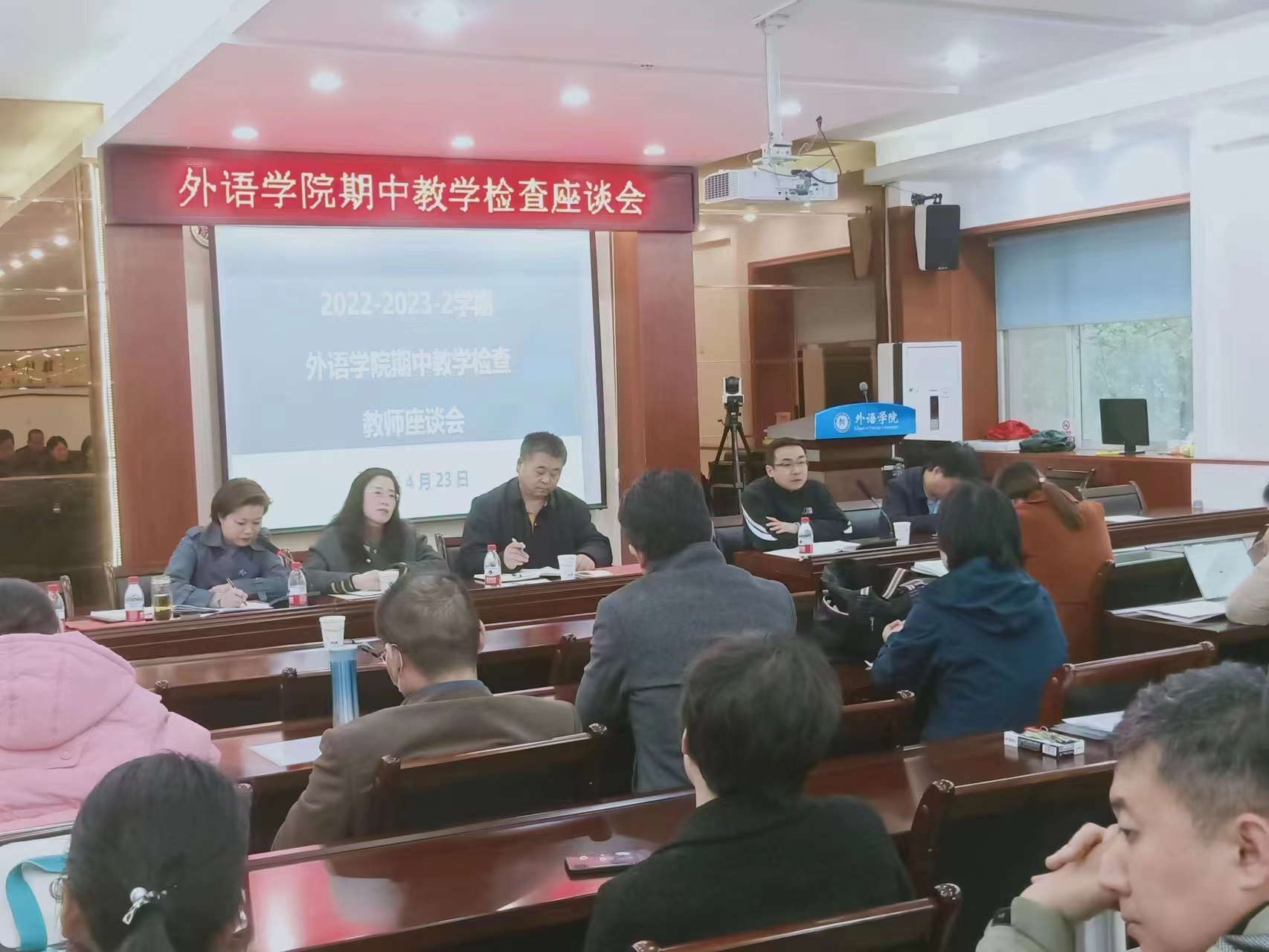 在5225会议室召开了本学期期中教学检查师生座谈会。学校督导组专家穆中杰教授、教师教学发展中心赵静主任、学院领导班子、教学办、学工办、本学期任课教师和学生代表参加了座谈会。会议由副院长葛丽萍主持。